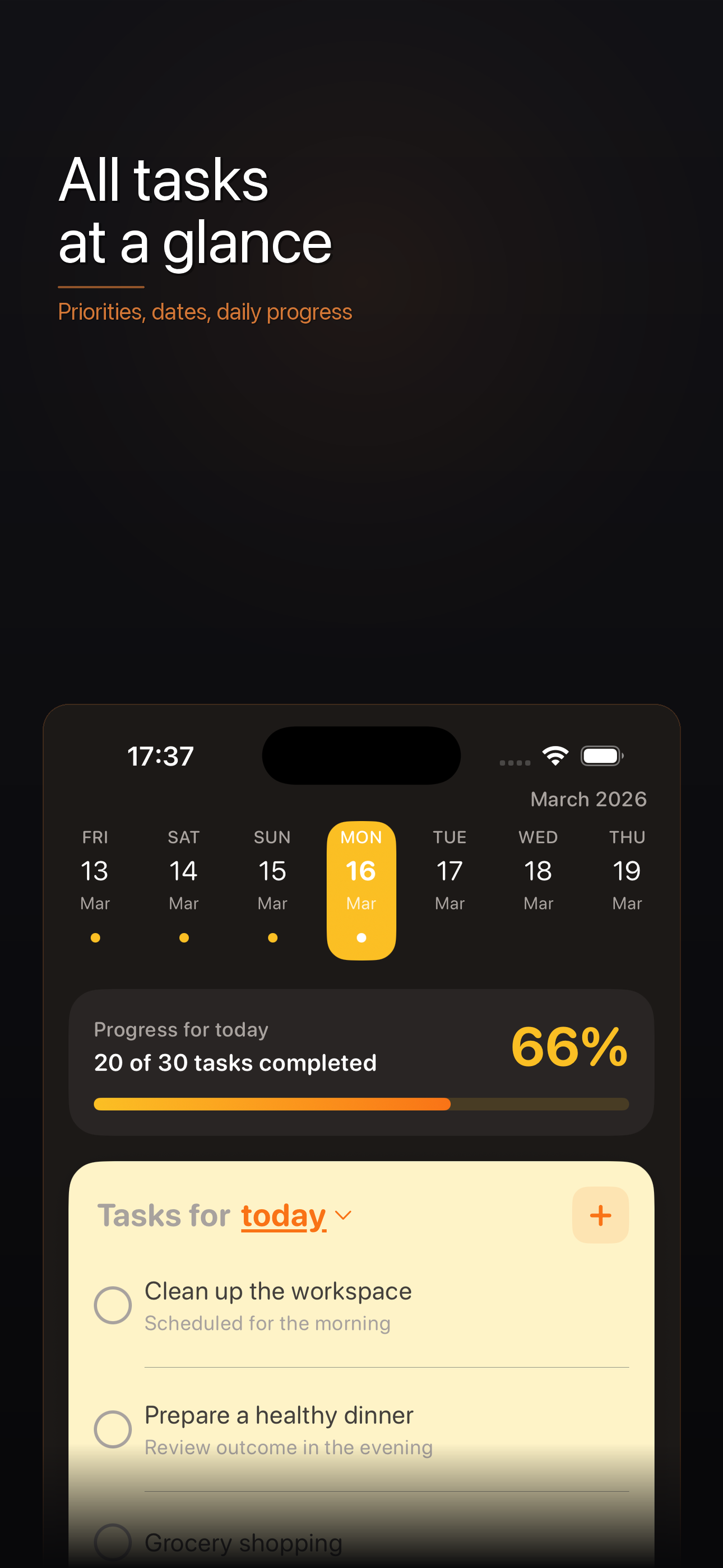 All tasks at a glance with priorities and daily progress. AI breaks complex tasks into simple actionable steps.